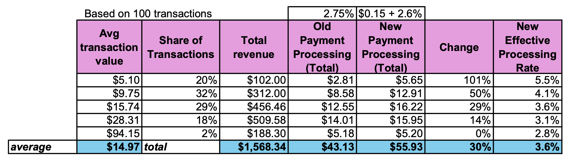Over half of the transactions we do are valued under $10 — folks who come in for a bagel and spread and maybe add a small coffee. Our cost of processing these small transactions (the first two brackets combined) has grown by 63% under the new fee structure.