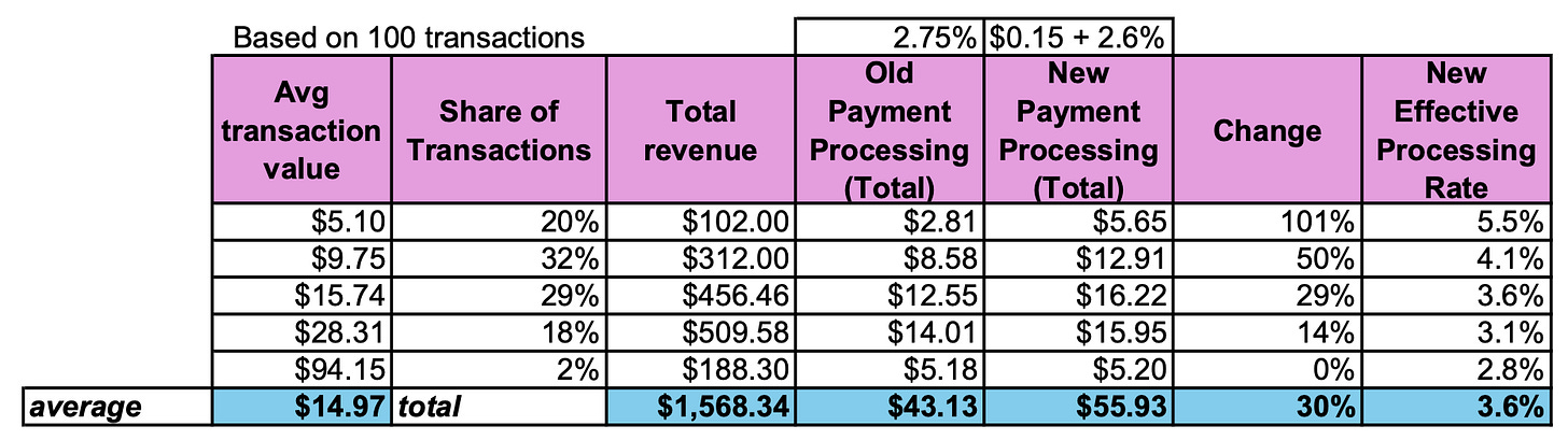Commission structures changed. Square, our POS and payment processor, used to charge a flat 2.75%. In 2019, that shifted to a hybrid model: a percentage plus a fixed fee per transaction (2.6% + 15¢). This shift is very important and we’ll come back to it in a second.